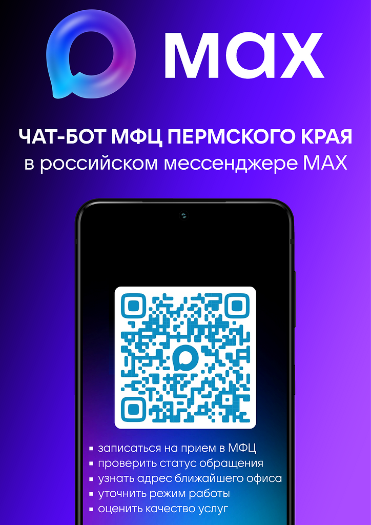 В Пермском крае запустили чат-бот центров «Мои Документы» в мессенджере МАХ. В основе виртуального помощника лежат технологии искусственного интеллекта. Сервис создан для того, чтобы сделать взаимодействие граждан с МФЦ еще более удобным. Новый цифровой помощник подскажет режим работы офисов «Мои Документы», через него можно записаться на прием или отменить запись, узнать статус своего дела. С его помощью можно быстро найти адрес нужного центра, оценить качество услуг. Сервис доступен в режиме 24/7. Кроме того, в MAX реализована система уведомлений о готовности документов. Ранее информация поступала через СМС-сообщения и «ВКонтакте». Теперь уведомления также будут приходить в MAX. Для начала работы с чат-ботом необходимо установить приложение MAX на смартфон, после чего найти бота «МФЦ Пермского края» через поиск в мессенджере или отсканировать специальный QR-код.